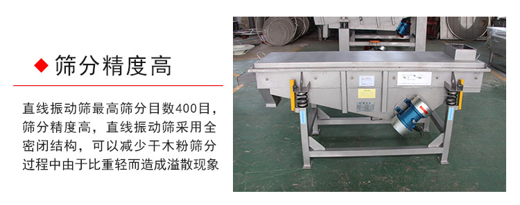 直線振動篩高篩分目數(shù)400目,篩分精度高,直線振動篩采用全密閉結(jié)構(gòu),可以減少干木粉篩分過程中由于比重輕而造成溢散現(xiàn)象。