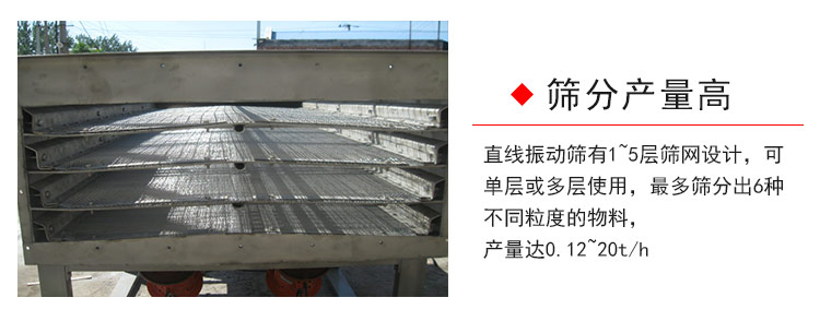 直線振動篩有1~5層篩網(wǎng)設計,可單層或多層使用,多篩分出6種不同粒度的物料,產(chǎn)量達0.12~20t/h。